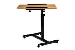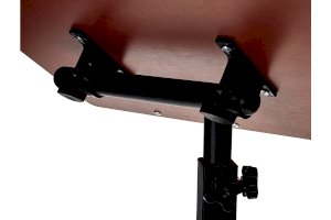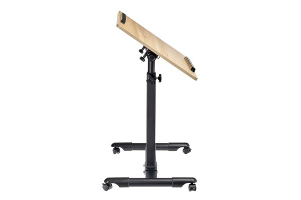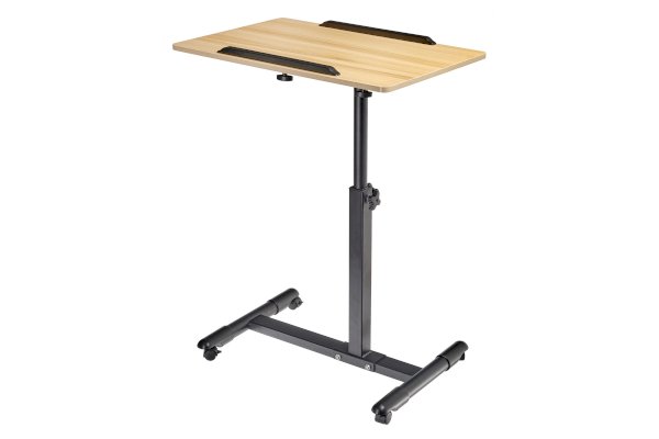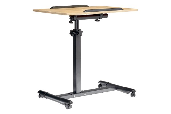 Столик оборудован поворотной столешницей из МДФ и металлическим основанием. Угол поворота столешницы составляет 180°, вплоть до вертикального положения. Высота подъема регулируется в диапазоне от 65 до 97 см. На столешнице имеются ограничители для ноутбука, планшета, предотвращающие падение гаджета.