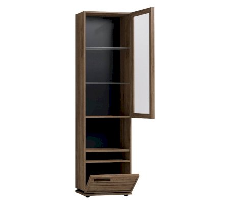 Высокий шкаф для посуды удобен своей функциональностью и эргономичностью конструкции. За тонированным стеклянным фасадом - 2 регулируемые по высоте бесцветные стеклянные полки. Витрина открывается за боковой свес. На открытой полке разместите фотографии или элементы декора, а за глухим откидным фасадом спрячьте документы и ценные вещи от посторонних глаз. Регулируемые опоры шкафа позволят компенсировать незначительные неровности пола.