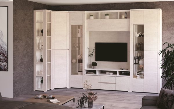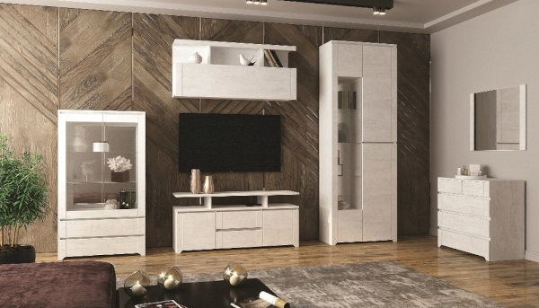 В центре модульного набора будет отлично смотреться ТВ-секция с навесной полкой. Шкафы-серванты с зеркальными дверцами позволят Вам расположить сервиз, предметы декора и книги. Вместительный комод с навесным зеркалом станут идеальным дополнительным вариантом для хранения одежды, белья и других личных вещей.