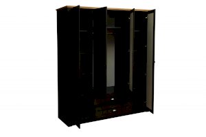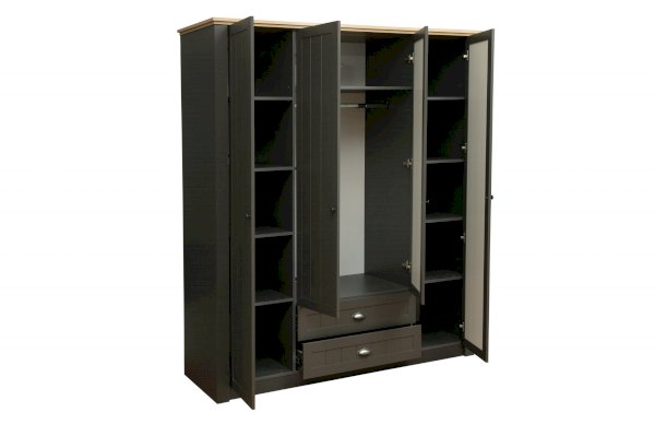 Четырехдверный шкаф с двумя выдвижными ящиками, в котором предусмотрен  полный цикл хранения вещей всех категорий! Общая ширина шкафа – 1764 мм – позволяет разместить очень многое. По центру – две распашные дверцы, которые открываются навстречу друг другу. Внутри находится отделение для вещей, которые хранятся на вешалках. Прочная металлическая штанга выдерживает вес до 20 кг. Она находится на оптимальной высоте – человеку даже с очень небольшим ростом будет легко и просто повесть свою вещь. Над металлическим подвесом располагается вместительная полка – глубиной в 600 мм, способная выдержать вес до 5 кг. Здесь можно разместить вещи, которыми мы пользуемся не так уж и часто.  Под центральным отсеком - два выдвижных ящика. Поскольку они находятся внизу, то лучше всего разместить в них коробки с обувью, но в конечном итоге – решать вам и размещать то, что необходимо – под индивидуальный запрос. По бокам – слева и справа – полки для вещей – в каждом отсеке по 5 полок. Полки выполнены из ЛДСП и выдерживают вес до 5 кг.
