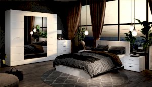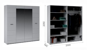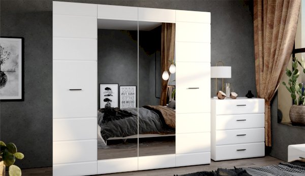 Распашной 4х дверный шкаф для одежды Йорк выполнен в современном стиле, сочетает в себе функциональность и эффектный внешний вид: строгая горизонтальная фрезеровка фасадов, контрастного черного цвета ручки и задняя стенка из ХДФ, элегантный белый цвет. Блеск глянцевых фасадов High Gloss из МДФ и зеркала наполняют комнату светом, делают ее просторнее. Внутри предусмотрены вместительные секции для белья и отделение со штангой. Мебель выполнена из экологически безопасных и надежных материалов.