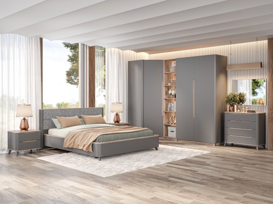 В этой спальне воплощены лучшие черты современного европейского дизайна! Теплой и уютной делает спальню сочетание двух текстур: древесная и матовый белый или оникс серый. Округлые, мягкие линии мебели создадут атмосферу покоя в спальне, а отсутствие острых углов обеспечат безопасность. Шкафы собираются по принципу бесконечного шкафа - это мебельный конструктор, из которого можно собрать свой шкаф мечты, где для каждой вещи найдется свое место.