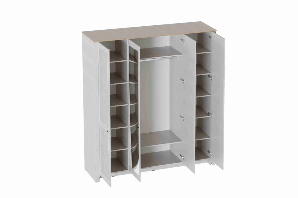 Шкаф 4 дверный Валенсия с зеркалом выполнен из ЛДСП в комбинации Дуб натуральный светлый / Персидский жемчуг.