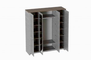 УФ-фотопечать полосок на фасадах в обрамлении пластиковых молдингов придает изделию оригинальный стиль современной классики. В центральной части шкафа расположена штанга для одежды, а также верхняя и нижняя полки, каждая из которых разделена на два отделения. Правая и левая части шкафа имеют по пять полок высотой 332 мм каждая. Задняя стенка шкафа изготовлена из ХДФ. На опорах размещены войлочные подпятники. Высота опор 104 мм. Зеркало выполнено с фацетом.