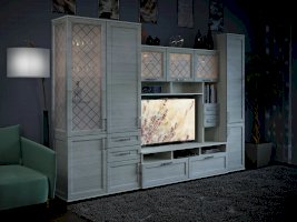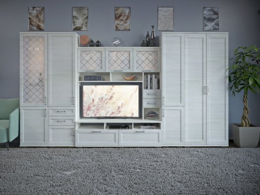 Помимо привлекательного дизайна, тумба под ТВ может похвастаться отличной функциональностью. Она имеет два вместительных ящика и два маленьких, открытые ниши под тв аппаратуру и полки под декор. Дверки со стеклом с пескоструйным рисунком добавляют модели легкость. Таким образом, тумба под ТВ при достаточно компактных размерах имеет множество мест для хранения. Это идеальный вариант для небольших гостиных.
