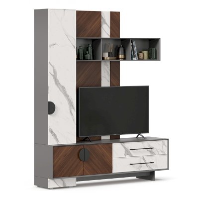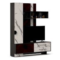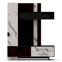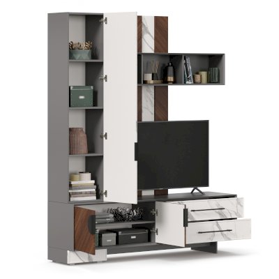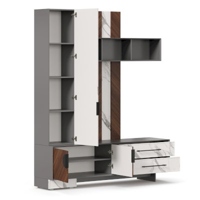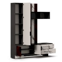 - Модуль скомбинирован из наборной панели, шкафа одностворчатого, тумбы для ТВ и открытых полок