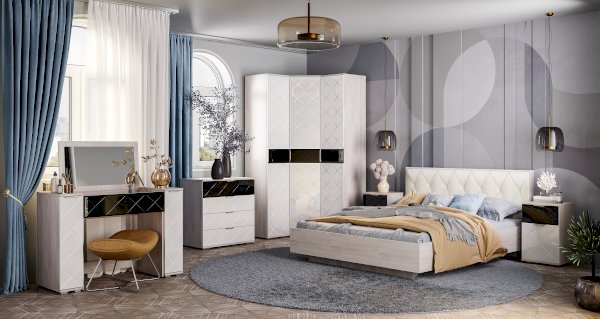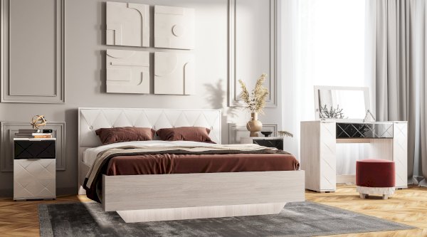 Двуспальная кровать из коллекции модульной мебели Кимберли станет центром вашей спальни. Выполненная в цвете белый ясень, модель прекрасно смотрится в светлом современном интерьере. Мягкое изголовье отделано экокожей и декорировано каретной стяжкой.