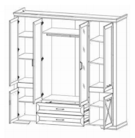 Два из трех верхних отделений за распашными дверцами скрывают полки, а центральное оборудовано штангой для развешивания одежды на плечиках.