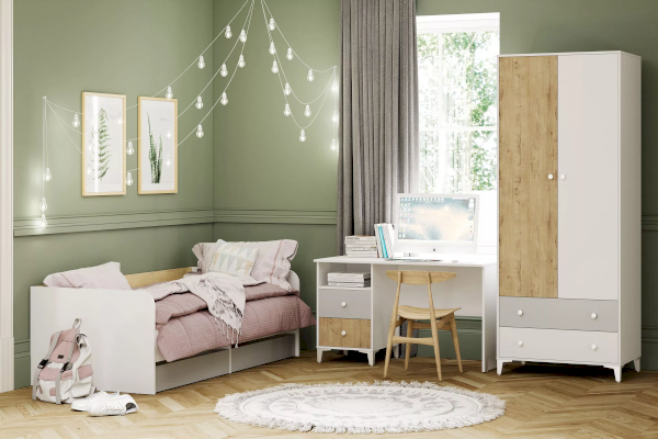 Односпальная кровать подходит для детской мальчиков и девочек в современном, скандинавском и стиле лофт. В кровати предусмотрены ящики для хранения постельного белья или игрушек. Натуральный материал ламелей не вызывает аллергии и безопасен для здоровья. Изогнутая форма ламелей придает основанию спального места большую прочность и дополняет ортопедические свойства матраса.