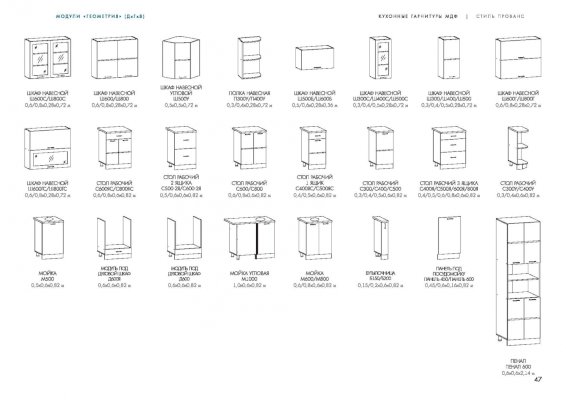 Набор кухонной мебели «Геометрия» получил свое название благодаря оригинальному дизайну. Дело в том, что его фасады украшены незатейливыми симметричными узорами, состоящими из небольших ромбов. Также комплекту присущи симметрия и простота форм. У покупателей есть возможность выбирать цветовое решение: в ассортименте изделия оттенков топаз, тирамису, гранат, алмонд.