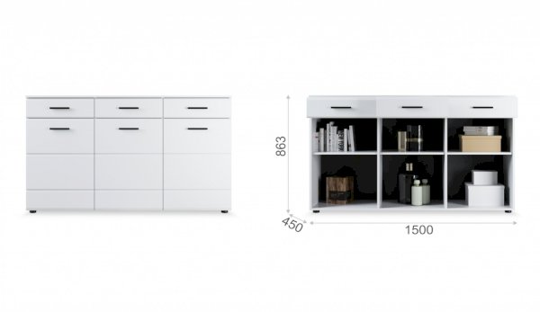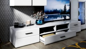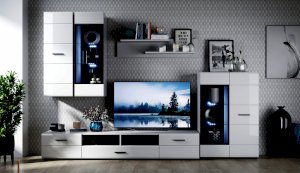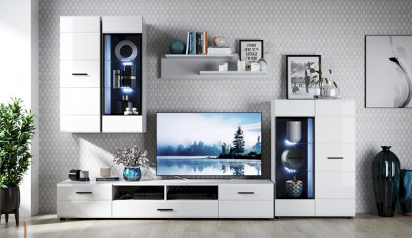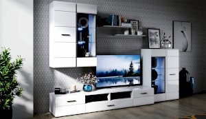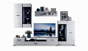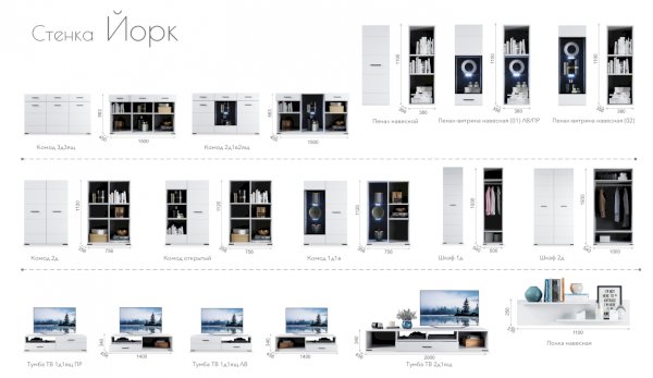 Модульная система Йорк выполнена в стиле минимализма. Строгие, лаконичные линии подчеркивают элегантность комплекта. Белый цвет мебели с деталями глубокого черного визуально сделает комнату светлее, просторнее и позволит составить безупречный по стилю комплект мебели. Сочетание глянцевой и стеклянной поверхностей, открытых полок создадут уютную обстановку и позволят украсить убранство комнаты приятными мелочами и разместить любимые книги и фото. Светодиодная подсветка придаст индивидуальность Вашей мебели. А широкая тумба для ТВ с выдвижными ящиками на телескопических направляющих позволит удобно разместить телевизор любой диагонали и другие медиаустройства Модульная система позволит подобрать по размеру вариант именно для Вашей комнаты, не оглядываясь на фиксированный размер, как в других стенках. Мебель выполнена из экологически безопасных материалов.