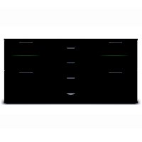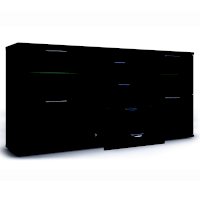 Комодино состоит из 3-х секций. Центральная комплектуется 4-мя ящиками на телескопических шариковых направляющих полного выдвижения с декором в центральных частях фасадов. Боковые секции делятся на две части. Верхние закрыты фасадами с тонированными стеклами, за которым располагаются стеклянные полки, а нижние — глухими с декоративными вставками из экокожи caiman темного цвета.
